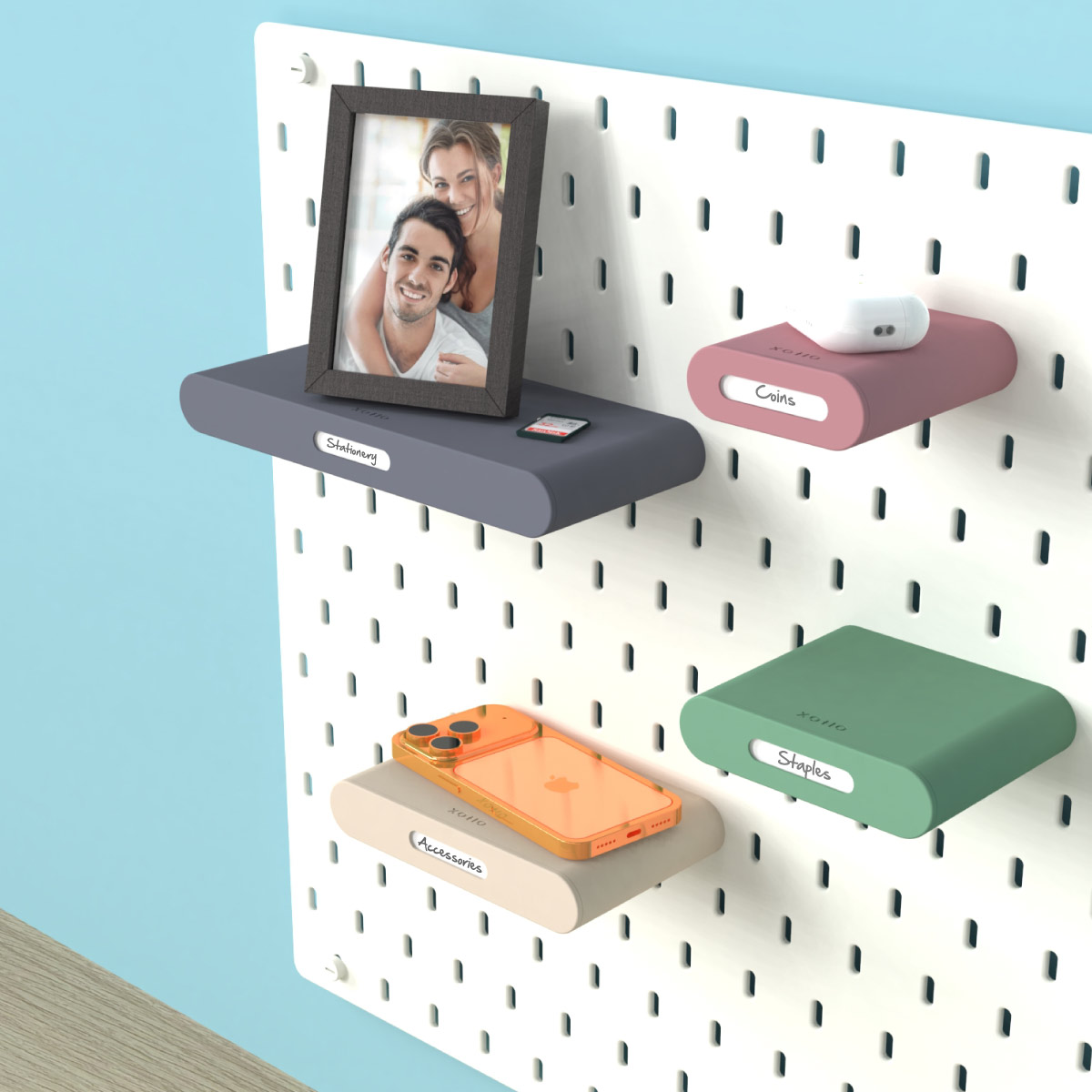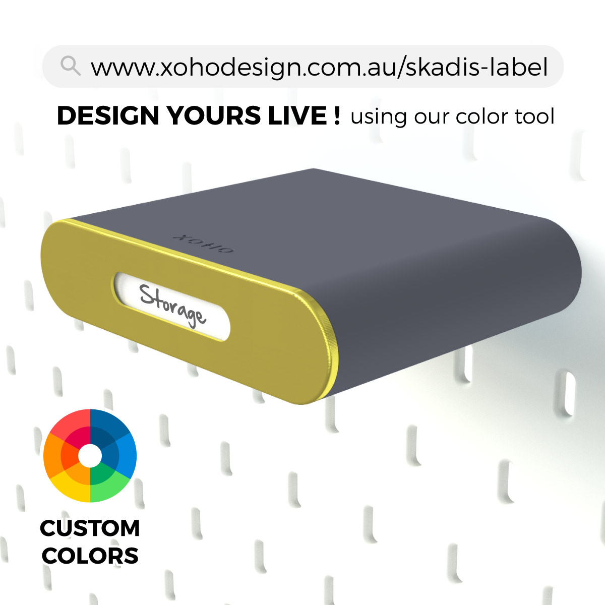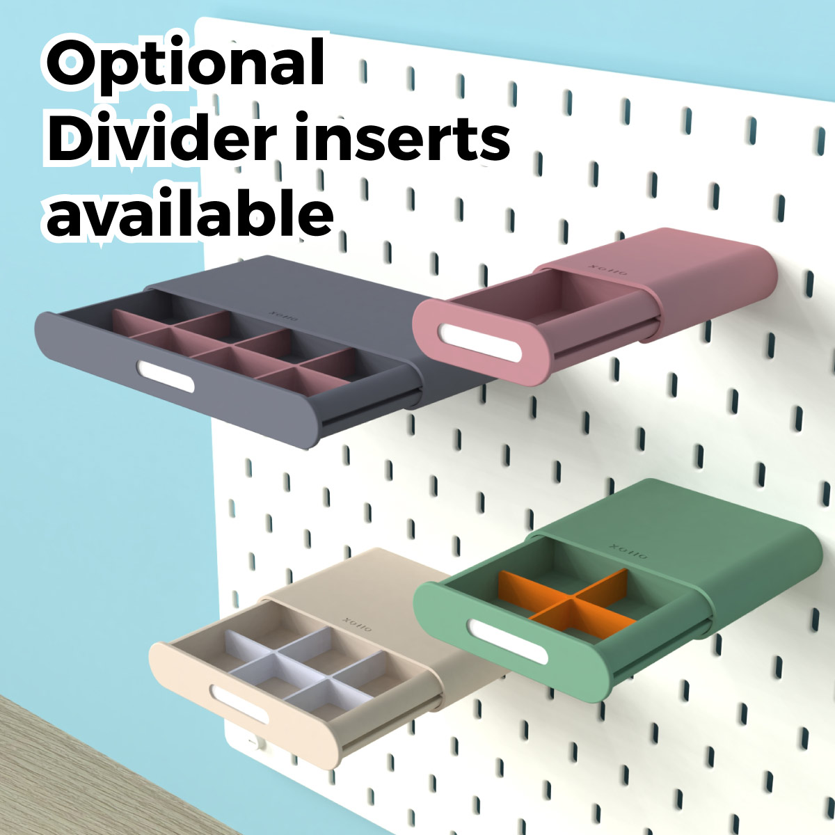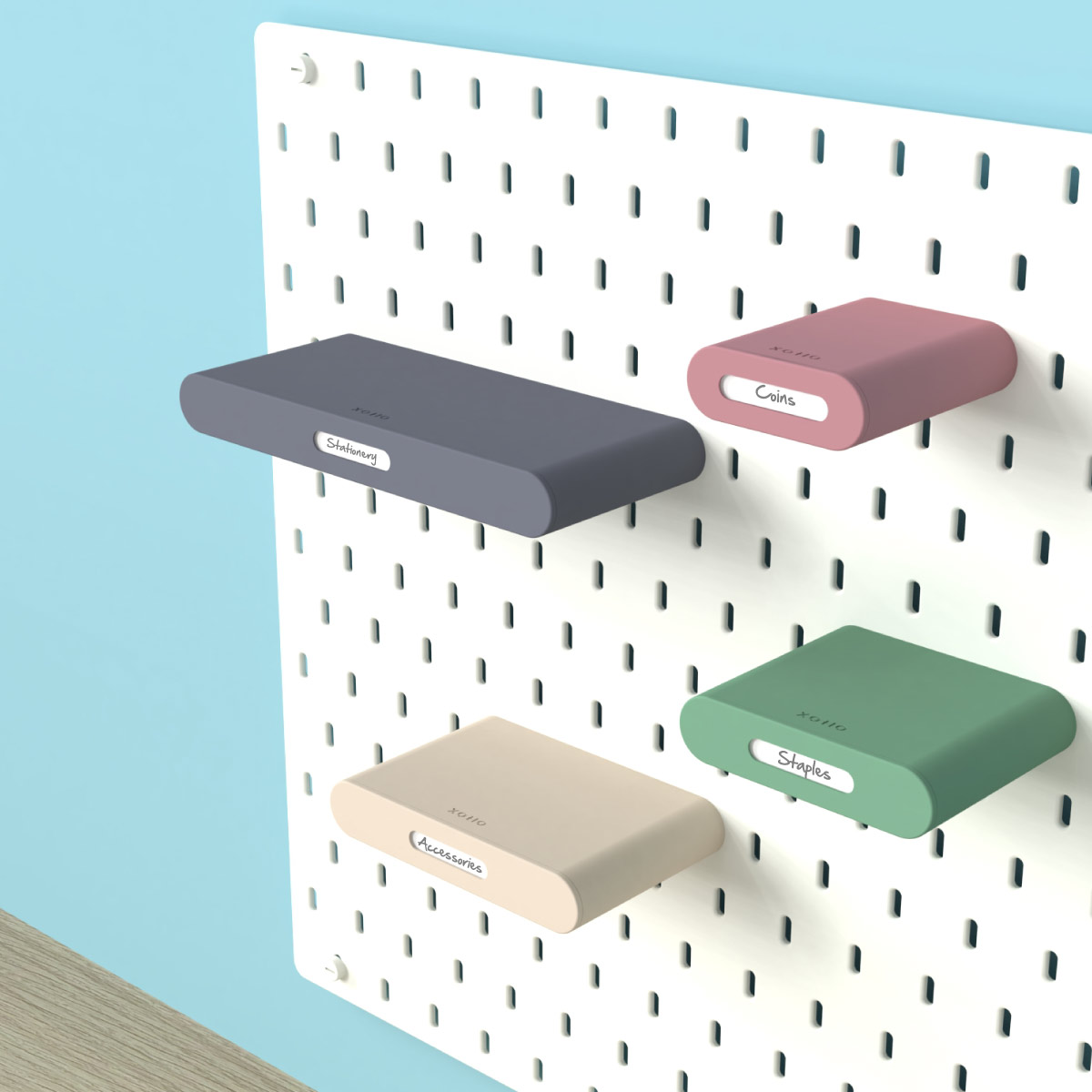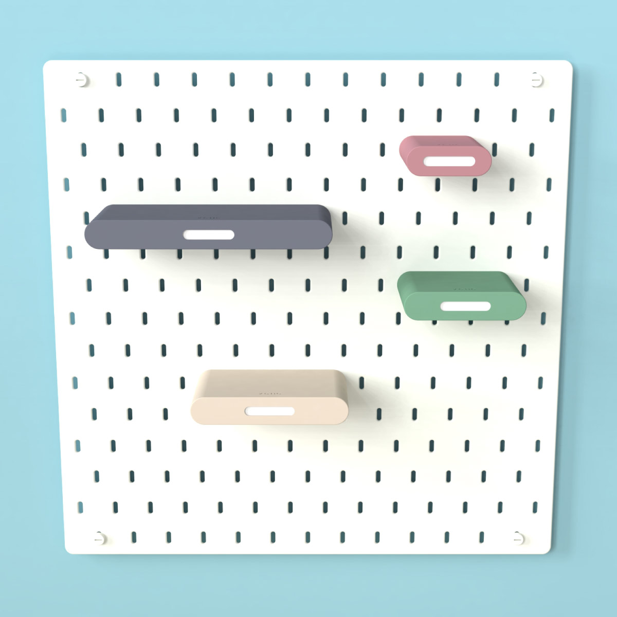 Designed for IKEA Skadis pegboard, this minimalist shelf features a hidden drawer, front label holder, optional divider inserts, custom colour combinations, and four available sizes for neatly organising stationery, cosmetics, screws, craft supplies, and other everyday essentials.