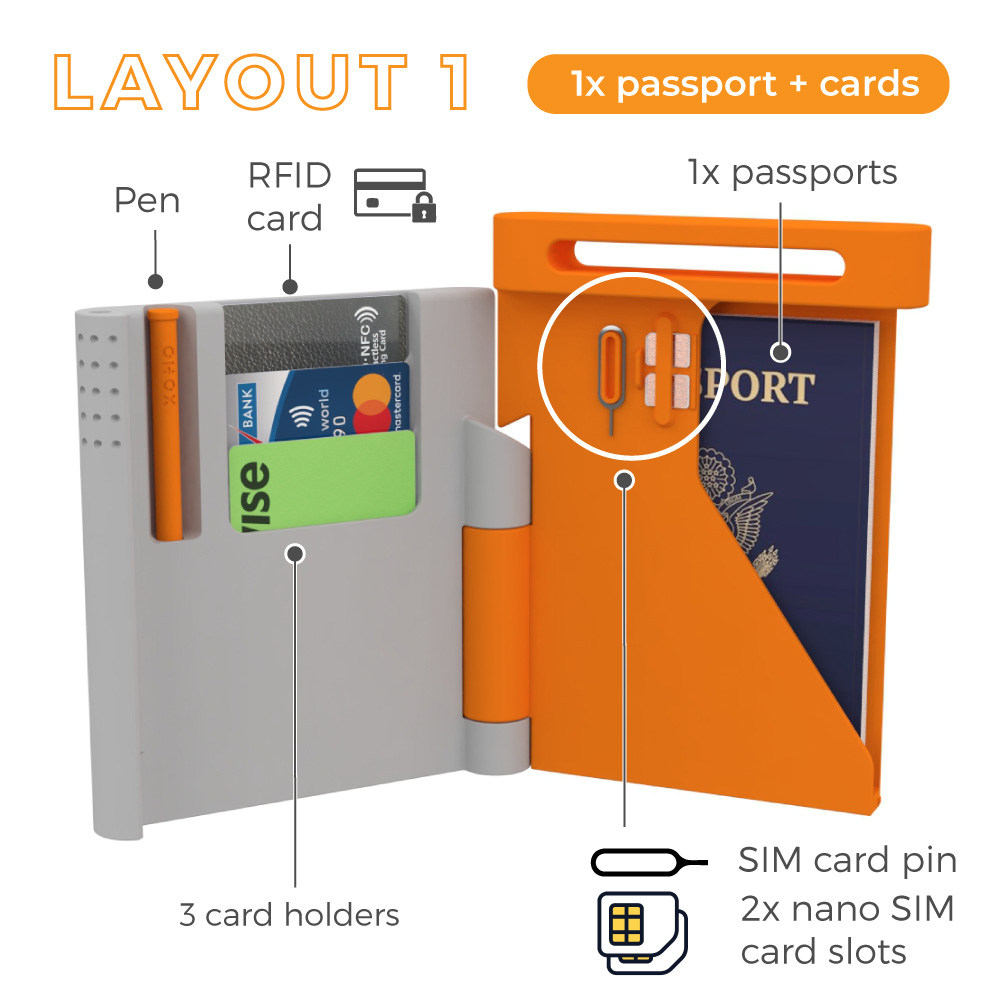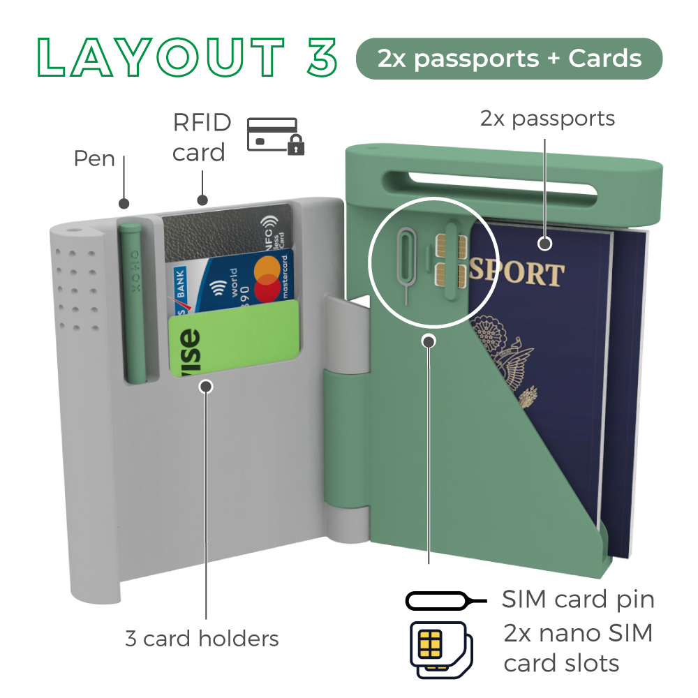 Our RFID passport holder wallet keeps travel essentials in one secure and easy-to-find place. No more searching drawers or bags before a trip. This durable 3D-printed passport holder is available in a range of layouts to store up to 3 standard-size passports.