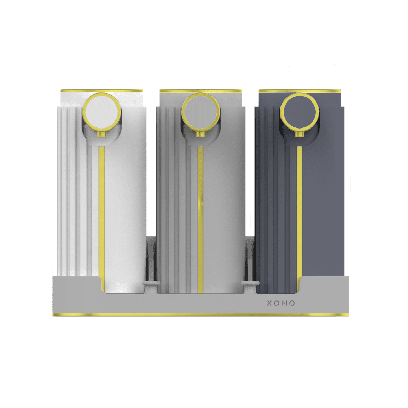 Say hello to the epitome of shower organisation and Art Deco style – a set of 3x 500ml / 17oz refillable soap dispensers with an accompanying shelf that revolutionises your bathing experience. This innovative solution not only minimises clutter but also adds a touch of elegance to your space. The sturdy, Art Deco style shelf is equipped with two built-in hooks to effortlessly hold shower sponges, ensuring a seamless bathing routine. Customisable in a range of colours, it’s designed to complement any decor. With elegant gold accents on both the bottles and shelf, this set unifies the design elements into a cohesive and luxurious unit.